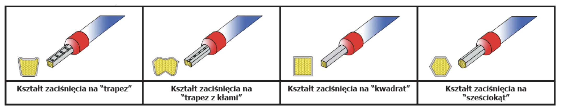 Do zaciskania tulejek (izolowanych i nieizolowanych) używa się prasek z matrycami w kształcie „trapezu”, „trapezu z kłami”, „kwadratu” lub „sześciokąta”. Zacisk „trapezowy” minimalnie deformuje kabel i końcówkę, a siła zacisku nie wpływa na rezystancję przejścia, ponieważ właściwy docisk zapewnia śruba dociskająca zacisk w gnieździe lub wtyczce. Dzięki temu możliwe jest stosowanie jednej matrycy dla końcówek o przekrojach 0,14–6 mm² lub 0,5–10 mm².