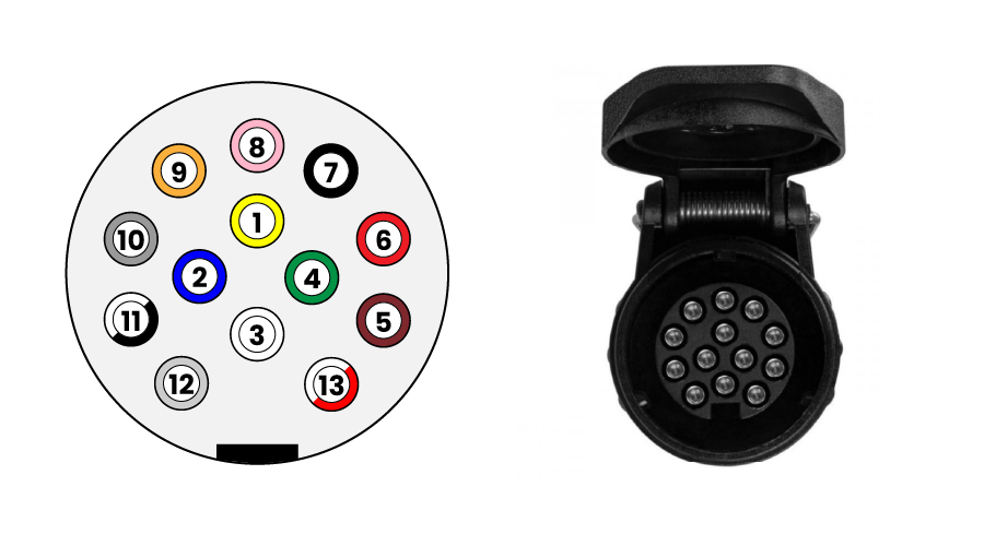 Gniazda i wtyczki w standardzie 12 V 13-pin są stosowane głównie w hakach holowniczych do przyczep, lawet, przyczep kempingowych oraz bagażników rowerowych. Obsługują wszystkie funkcje dostępne w standardzie 12 V 7-pin a ponadto światło cofania, stałe zasilanie przyczepy oraz zasilanie sterowane wyłącznikiem zapłonu.