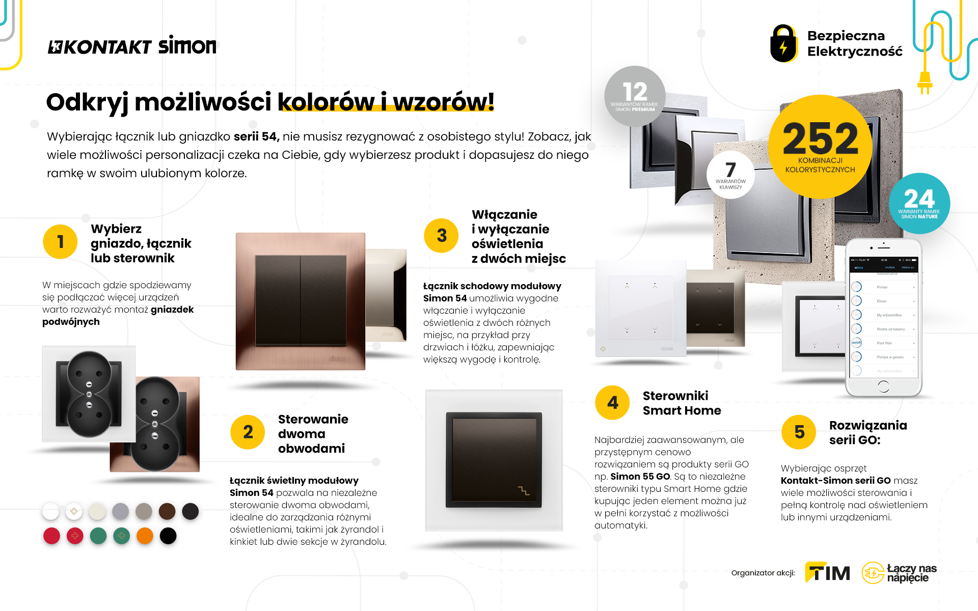 To nie koniec. Decydując się na serię Simon 54 lub np. Simon 55 mamy możliwość zamontowania w naszej tradycyjnej instalacji elektrycznej osprzętu Smart Home. Nowoczesne rozwiązania mają ułatwiać, a nie utrudniać życie co szczególnie docenią osoby, które mają utrudnione poruszanie się, lub osoby, które lubią nowe rozwiązania, automatyzację i możliwość sterowania domem np. z aplikacji na smartfonie.