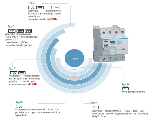 Skoro są nowe zagrożenia, to nie powinno nikogo dziwić, że powstały inne typy zabezpieczeń różnicowoprądowych np. A; Hi; F; B; B+, które zapewniają wyższy poziom ochrony i które należy dobierać w zależności od rodzaju zagrożeń występujących w naszej instalacji.