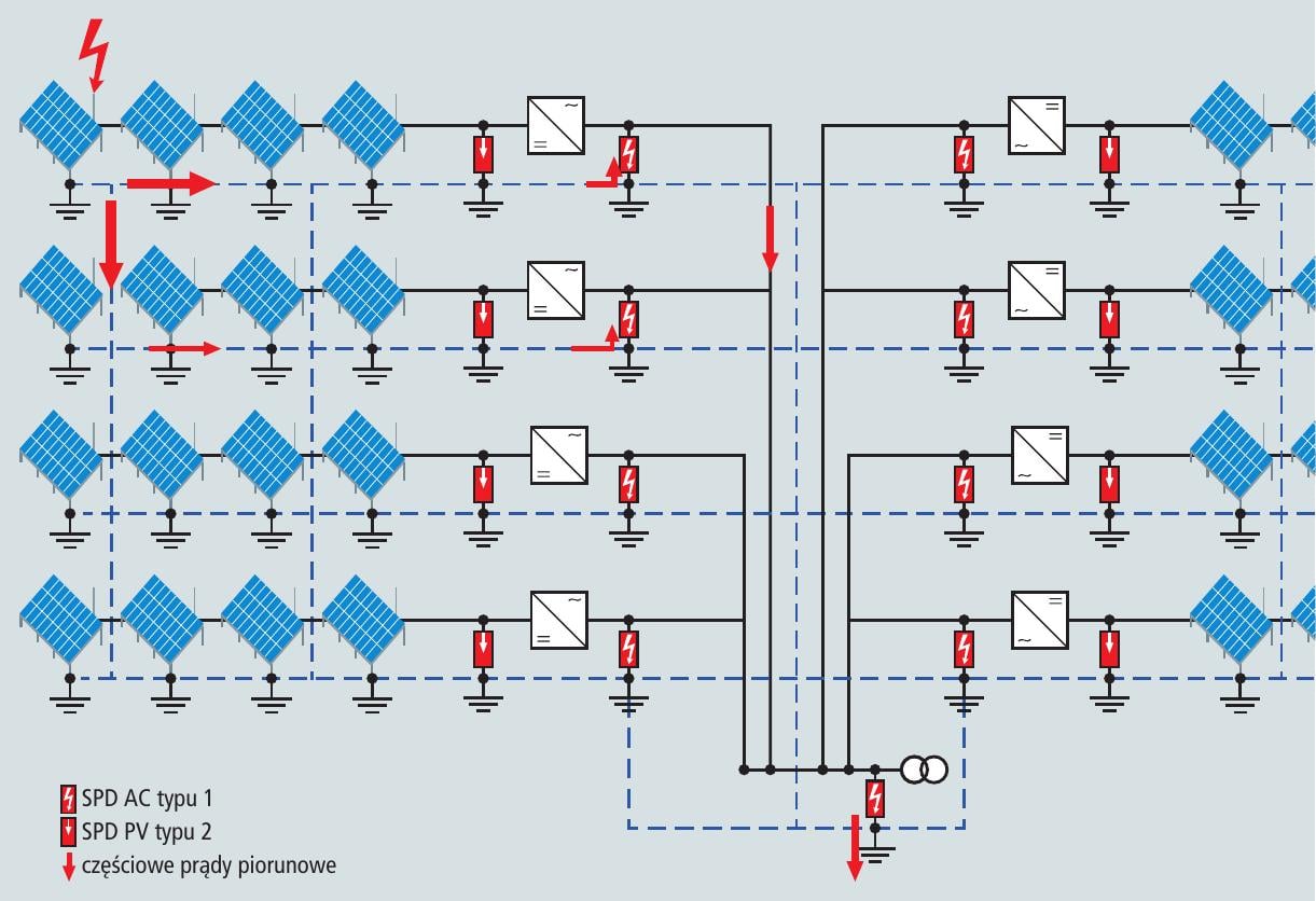 Jeśli wyładowanie piorunowe nastąpi w pole modułów PV lub zwód pionowy, prąd piorunowy jest odprowadzany przez ramę PV (zwód) do ziemi, a następnie rozprzestrzenia się we wszystkich kierunkach od punktu wniknięcia. Częściowe prądy piorunowe popłyną ścieżką największej różnicy napięć i najniższej rezystancji. Dlatego częściowe prądy piorunowe będą poprzez SPD po stronie AC falownika wnikać do przewodów instalacji i płynąć w kierunku stacji transformatorowej, gdzie następnie będą rozpraszane przez instalację uziemiającą stacji transformatorowej (rys. 2).