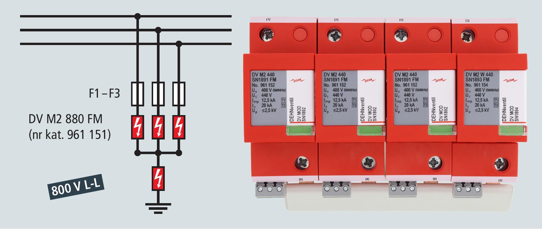 Ze względu na konfigurację „układ Neptuna” (3+1) dwa SPD są zawsze połączone między sobą szeregowo (L-L; L-GND). Ogranicznik DEHNventil DV M2 440 posiada największe napięcie trwałej pracy AC 440 V. W przypadku połączenia szeregowego maksymalne ciągłe napięcie robocze kombinacji ograniczników zostaje podniesione do 880 V AC i jest zatem idealnie przystosowane do stosowania w sieciach 800 V AC. Układ znajduje zastosowanie w sieciach IT w których: