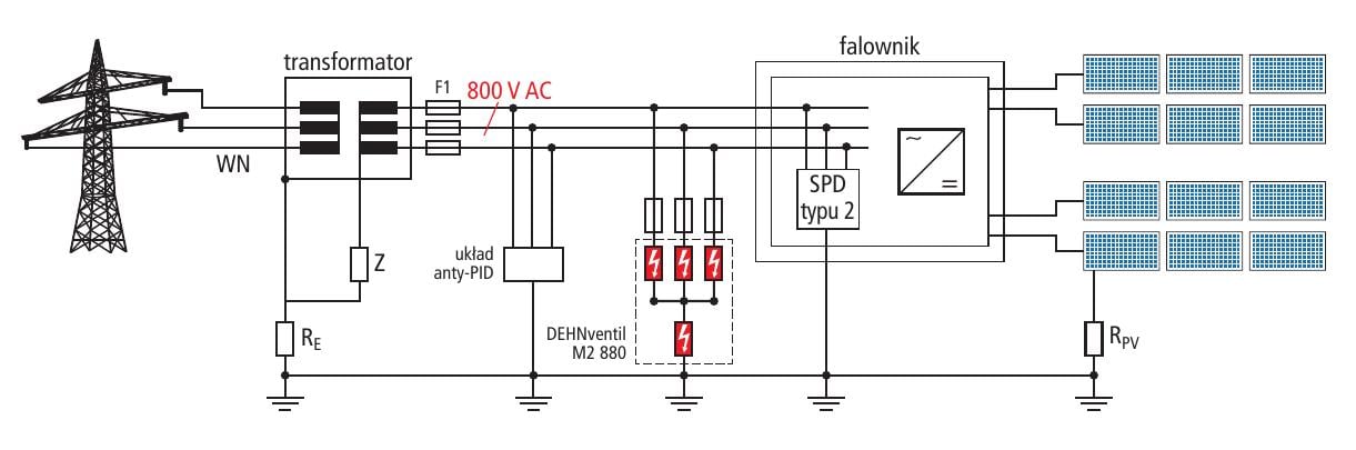 Ogranicznik DEHNventil DV M2 880 jest odporny na działanie układu ochrony przed PID (tak jak pokazano na rys. 5), może pracować w instalacji 508 VAC + 750 VDC – zastosowane ograniczniki przepięć nie zostaną wyzwolone. W ten sposób zagwarantowana jest bezpieczna praca falownika.