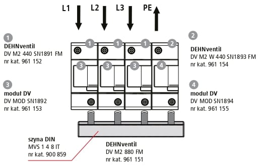 Układ SPD do sieci IT 800 V (DV M2 880 FM, nr kat. 961 151) jest dostarczany w stanie niezmontowanym. W skład zestawu wchodzi też nowa modułowa szyna mostkująca zapewniająca pełną ochroną styków przed dotykiem. Dostawa poszczególnych komponentów następuje w jednym opakowaniu, a dołączona do każdego produktu instrukcja instalacji pozwala na wykonanie szybkiego montażu kompletnego ogranicznika.