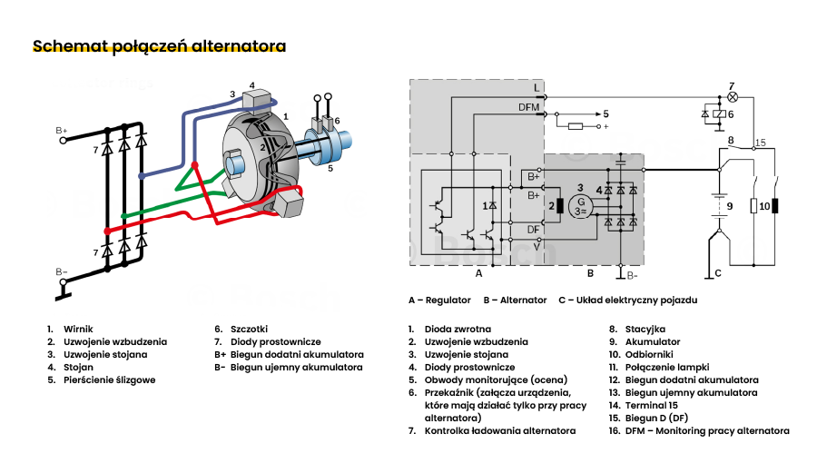 Podłączenie alternatora Bosch różni się od wielu konkurencyjnych modeli zarówno budową, jak i sposobem sterowania. W wielu wersjach stosuje się zintegrowany regulator napięcia oraz zaciski oznaczone literami B+, D+, W i DF. Istotne jest poprawne zidentyfikowanie każdego z nich, ponieważ niektóre wersje Bosch wykorzystują sygnał PWM do sterowania wzbudzeniem.