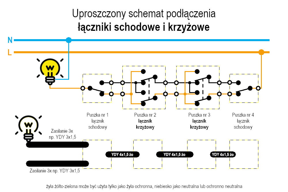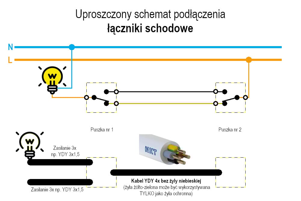 W odróżnieniu od wcześniej omawianych łączników, łączniki schodowe wymagają innego sposobu prowadzenia instalacji. W zależności od przyjętego rozwiązania, obwód schodowy może być zasilany z jednej lub dwóch różnych puszek. Choć zasada działania pozostaje taka sama, każde z tych rozwiązań wymaga zastosowania kabli o innej liczbie żył.