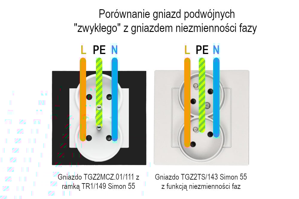 Problem ten dostrzegli producenci osprzętu, którzy coraz częściej oferują gniazdka podwójne z funkcją niezmienności fazy, niezależnie od tego, czy korzystasz z gniazda dolnego, czy górnego, zacisk fazowy zawsze znajduje się po tej samej stronie względem bolca ochronnego. Tego typu rozwiązania określane są jako gniazda z przeplotem lub gniazda z funkcją niezmienności fazy.