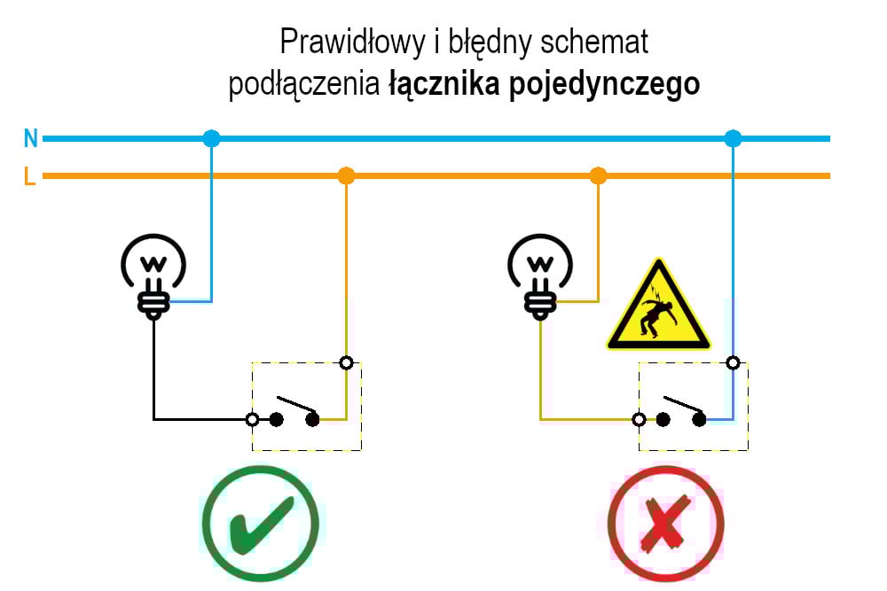 - Montaż łącznika na żyle neutralnej – łącznik powinien rozłączać żyłę fazową. Choć z punktu widzenia użytkownika rozłączenie żyły neutralnej również przerywa obwód i wyłącza odbiornik (np. oświetlenie), to w rzeczywistości na oprawie oświetleniowej nadal obecne jest napięcie fazowe. Taka sytuacja stwarza realne zagrożenie porażenia prądem, szczególnie podczas wymiany źródła światła lub czyszczenia oprawy.