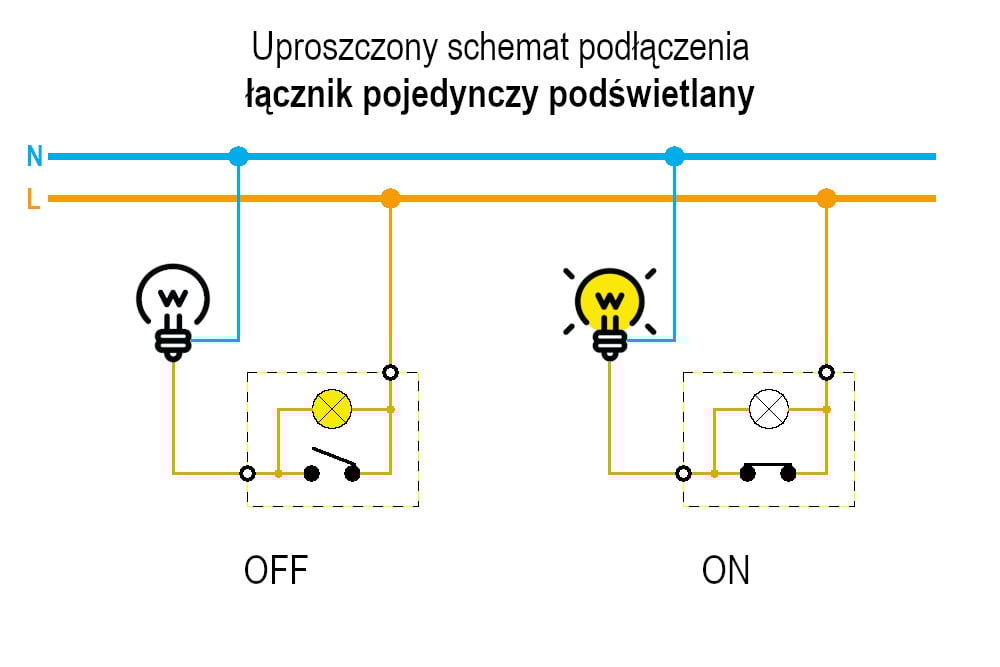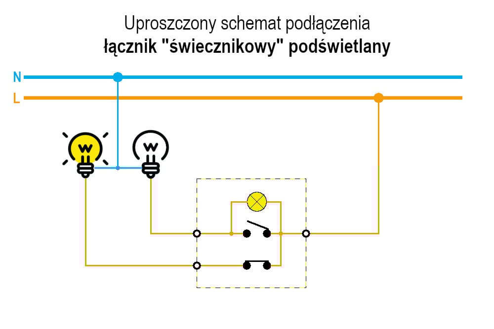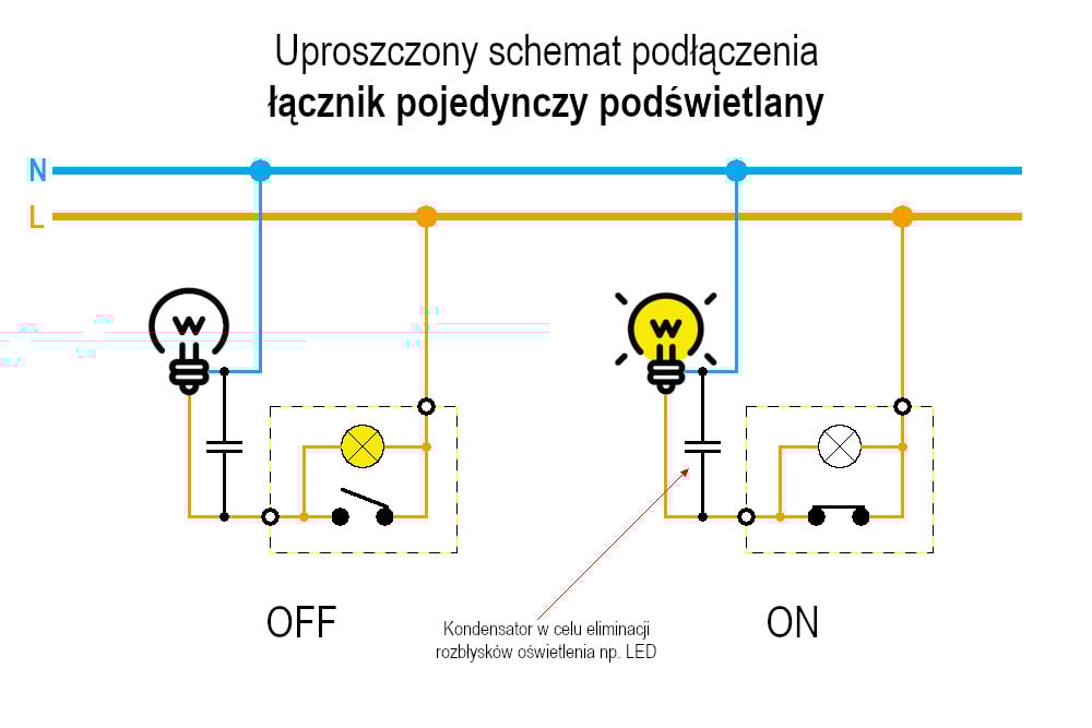 Zwróć uwagę na poniższy schemat: gdy łącznik z podświetleniem znajduje się w pozycji wyłączonej, obwód zostaje zamknięty przez element podświetlający. Prąd płynący w obwodzie jest zbyt mały, by zasilić źródło światła (np. żarówkę), ale wystarczający, by powodować delikatne żarzenie lub miganie świetlówek energooszczędnych oraz nowoczesnego oświetlenia LED.