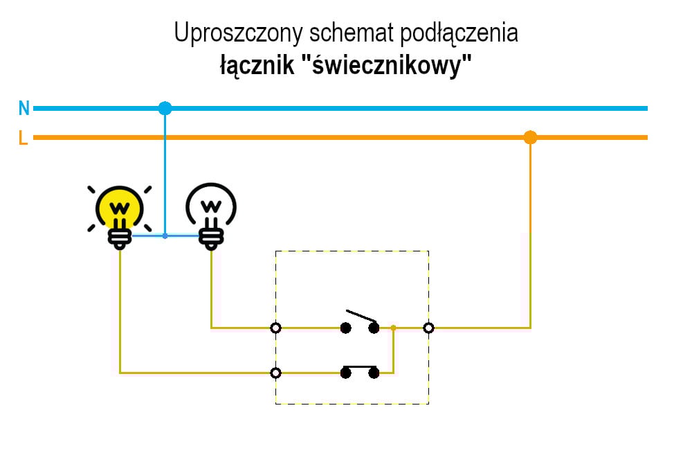 Podobnie jak łącznik pojedynczy, łączniki świecznikowe występują w wersji z podświetleniem oraz bez niego. Warto zwrócić uwagę, że w przypadku wersji z podświetleniem, element podświetlający jest podłączony tylko do jednego z dwóch obwodów.