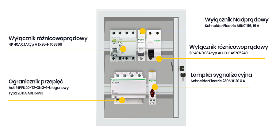 - Wyłączniki nadprądowe oraz różnicowoprądowe jako zabezpieczenia poszczególnych obwodów.