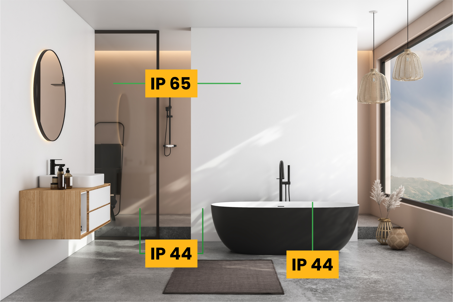 Oprawy łazienkowe i inne urządzenia mogą być opatrzone oznaczeniem klasy IP (ang. Ingress Protection), które określa stopień, w jakim element elektryczny jest zabezpieczony przed ciałami stałymi i cieczami. IP to kombinacja liter „IP”, po których następują dwie cyfry. Pierwsza cyfra oznacza ochronę przed ciałami stałymi (takimi jak kurz i inne obce ciała), a druga — ochronę przed cieczami. Im wyższa druga cyfra, tym większa jest odporność urządzenia na wodę, co jest szczególnie istotne dla oświetlenia w łazience.