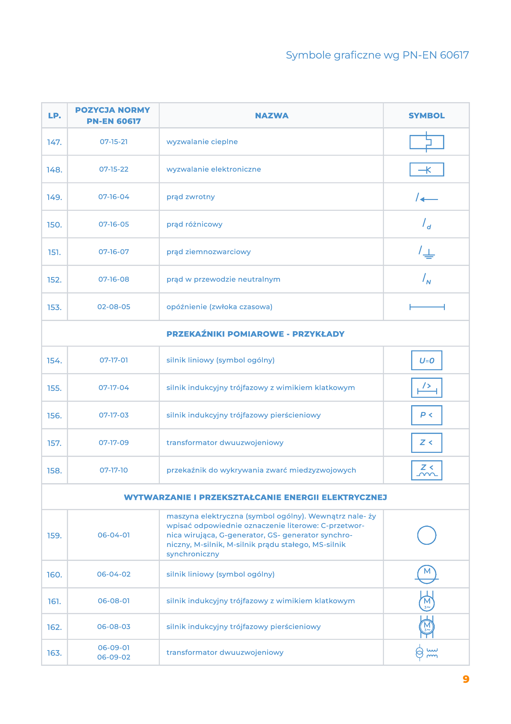 Norma IEC 60617 zawiera setki symboli, ale niektóre z nich są szczególnie często spotykane w dokumentacjach elektrycznych: