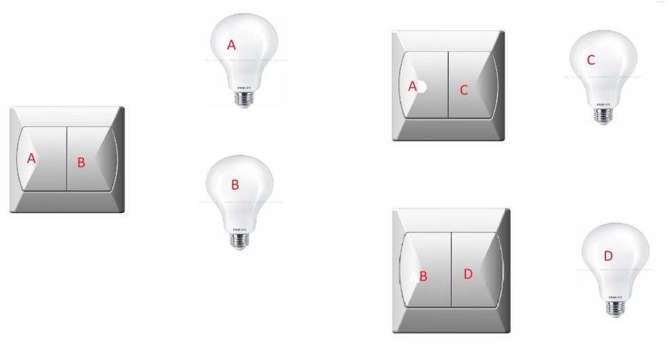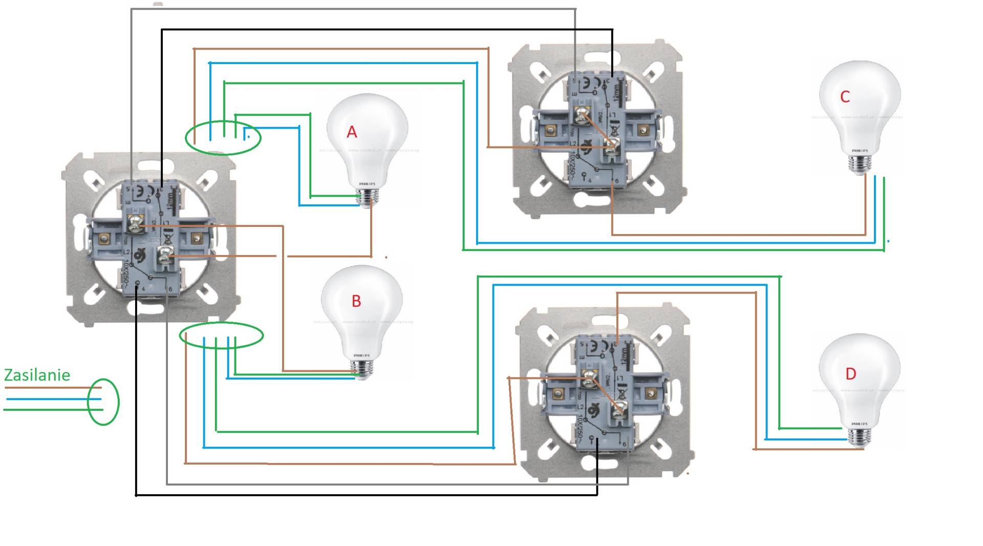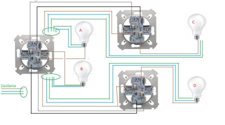 Na razie mam zrobione tak, że zasilanie przychodzi do łącznika BD, bo w nim i w AC jeden styk działa jako zwykły łącznik, a nie schodowy, a w AB oba działają jako schodowe i trochę zgłupiałem czy w ogóle da się tak to zrobić.