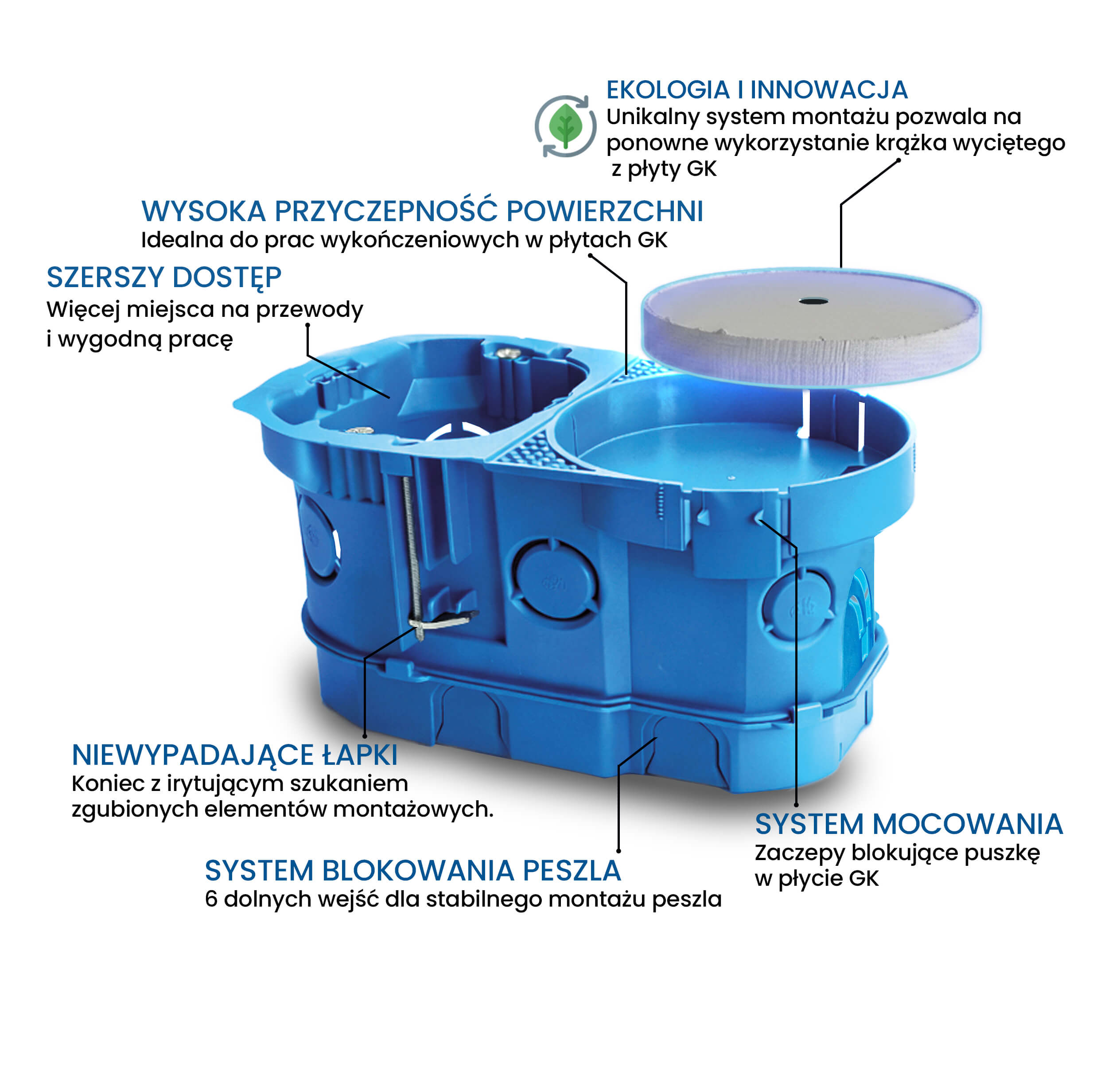 - Ekologia i innowacja (Zero Waste): Unikalny system montażu pozwala na ponowne wykorzystanie krążka wyciętego z płyty GK. Służy on do stabilnego zablokowania puszki w GK i redukują ilość odpadów na budowie.