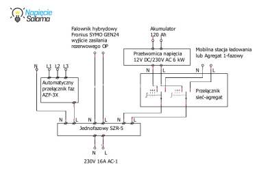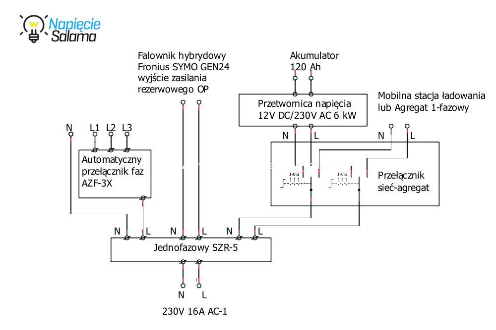 @automatyka pollin: w załączeniu zamieszczam poglądowy, zrobiony na szybko schemat jaka jest idea tego układu w którym użyłem Waszego AZF-3X i SZR-5. Ogólnie w ostatnich miesiącach układ przeszedł ewolucję. Zależało mi na wykonaniu awaryjnego zasilania wybranych obwodów jednofazowych z wykorzystaniem rezerwowego wyjścia z falownika hybrydowego, aby korzystać z energii gdy nie ma zasilania sieciowego, a jest słońce, ale ponieważ w ostatnich dniach zaszły zmiany i montuję spory magazyn energii (będę zdejmował i sprzedawał dwa hybrydowe falowniki Fronius SYMO GEN24 Plus o mocy 10 kW i 5 kW) więc układ ewoluował, ale nadal jest potrzebny. Dlaczego? Bo w budynku mam układ sieci TN-C-S gdzie TN-S będzie zasilana z magazynu energii, ale TN-C nie ma takiej możliwości więc w ta część obwodów będzie w razie zaniku zasilania sieciowego będzie zasilana dzięki AZF-3X i SZR-5