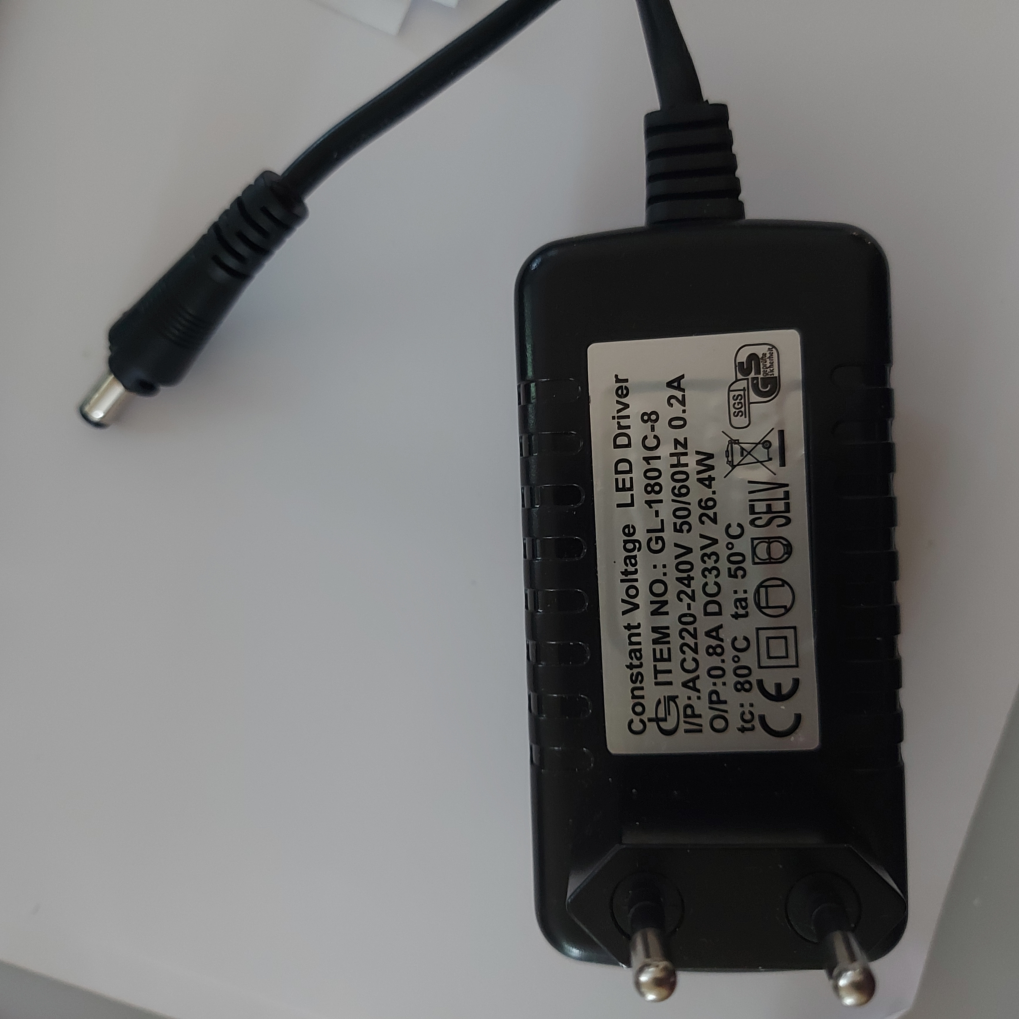 Jest to zasilacz stałonapięciowy o napięciu 33V i prądzie obciążenia 0,8A. Należy więc szukać zasilacza o napięciu 33V DC, natomiast prąd co najmniej 0,8A, ale może być większy (im większy prąd tym większe obciążenie można podłączyć do zasilacza). Np.: