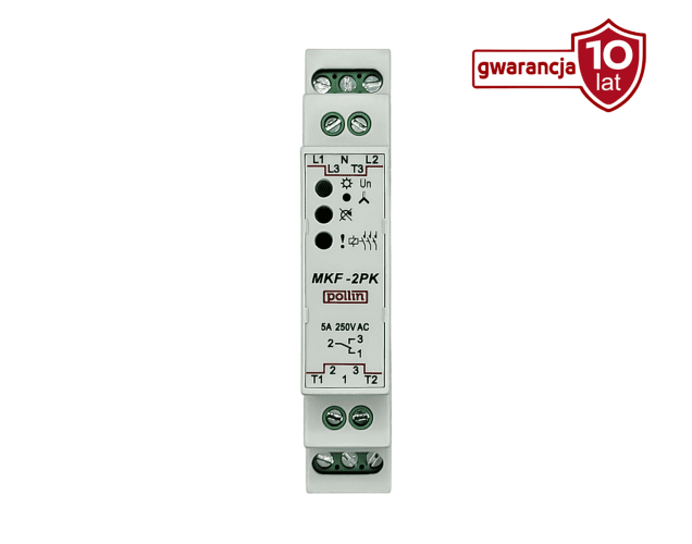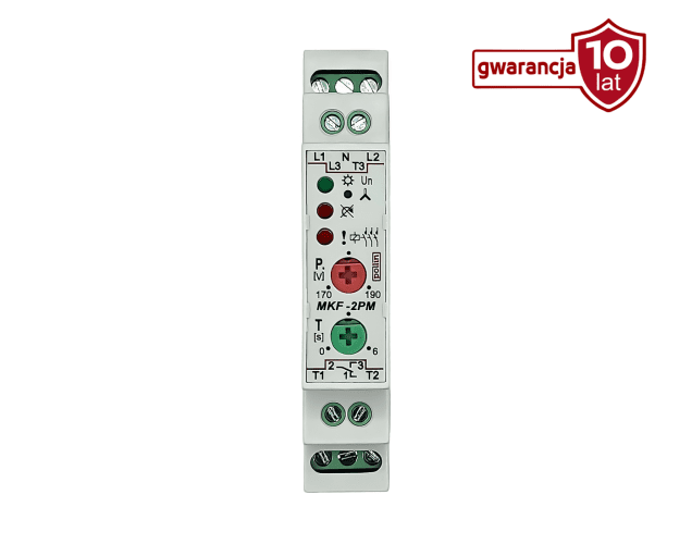 Przekaźnik typu MKF monitoruje parametry sieci zasilającej silnik i w przypadku wykrycia zagrożenia (takiego jak zanik fazy, asymetria napięć czy błędna kolejność faz) wysterowuje stycznik, czyli odłącza zasilanie silnika, chroniąc go przed uszkodzeniem. Po ustaniu awarii może automatycznie przywrócić zasilanie.
