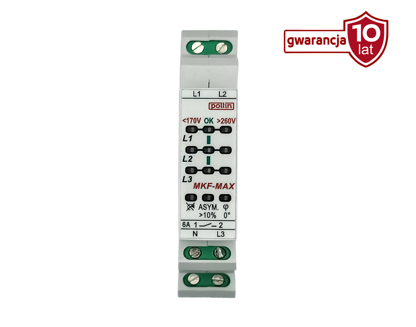 12 diod LED daje pełny obraz stanu sieci. Styk zwierny (6 A / 250 V AC) umożliwia integrację z systemem zabezpieczeń. Montaż: 1 moduł na szynę DIN, zasilanie 3× 400 V +N.