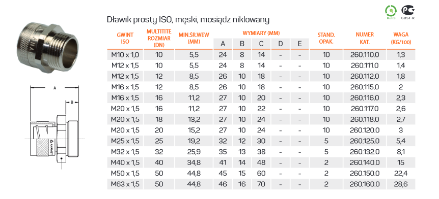 Dławik prosty ISO, męski, mosiądz niklowany M32 x 1,5.