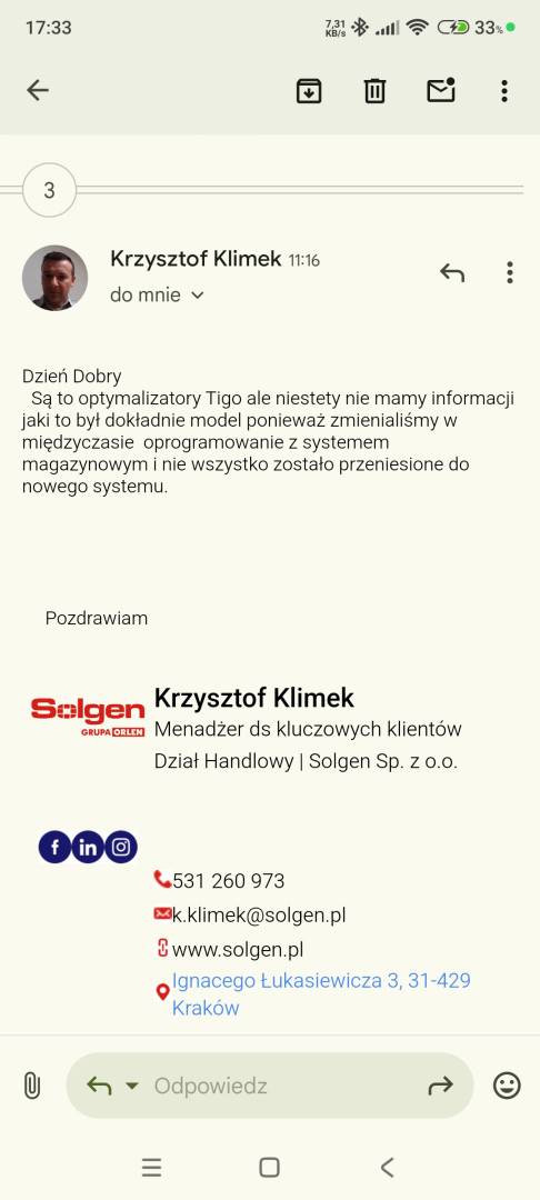 Kontaktowałem, chciałem otrzymać jakie konkretne optymalizatory są zamontowane, niestety nic z tego.
