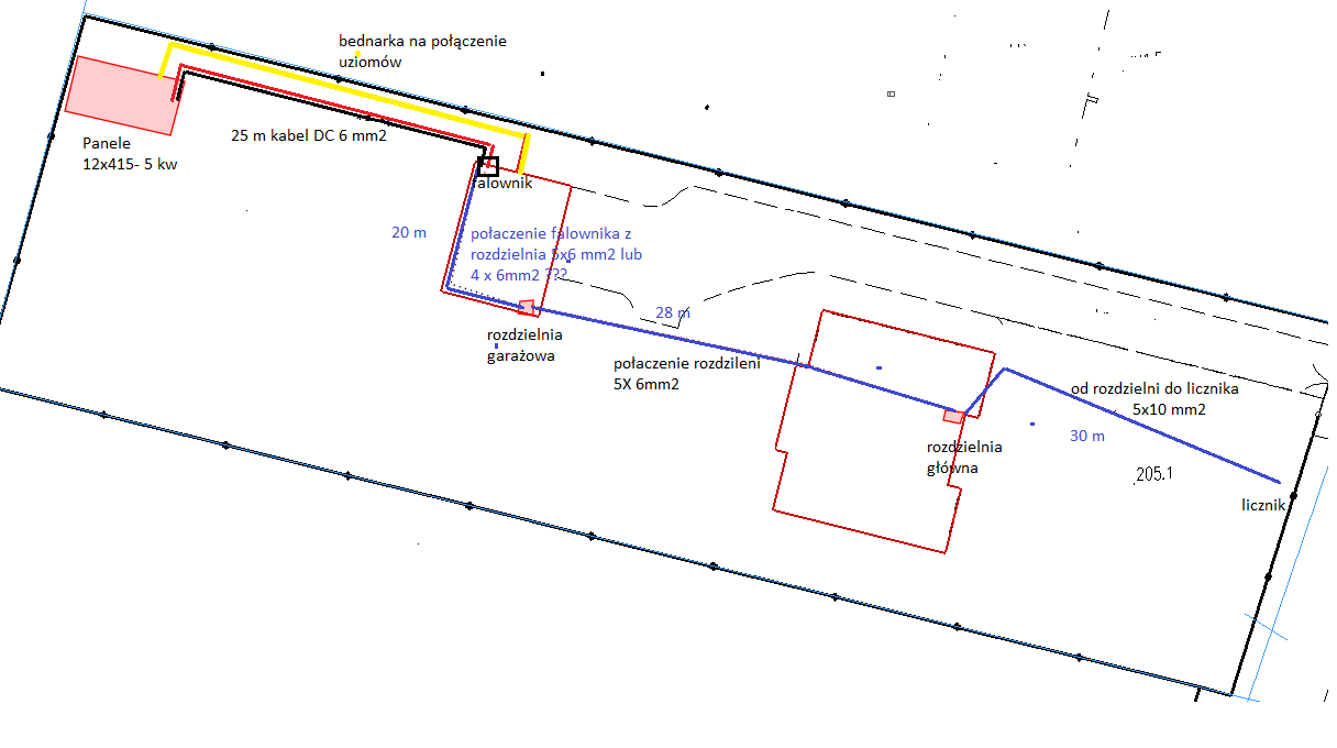 1. w samym garażu od falownika do rozdzielni garażowej 5x6 lub 4x6 (nie wiem czy łączyć uziemienie) ok 20 m.