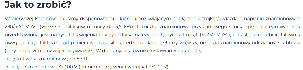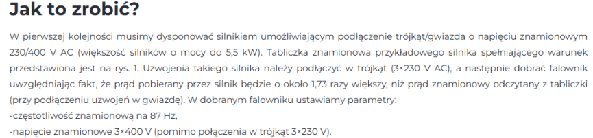 @Sebastian Łyźniak: Artykuł zwraca uwagę żeby podać napięcie 400V pomimo połączenia w trójkąt 230V. Ciekawe jak to działa i czemu można tak robić