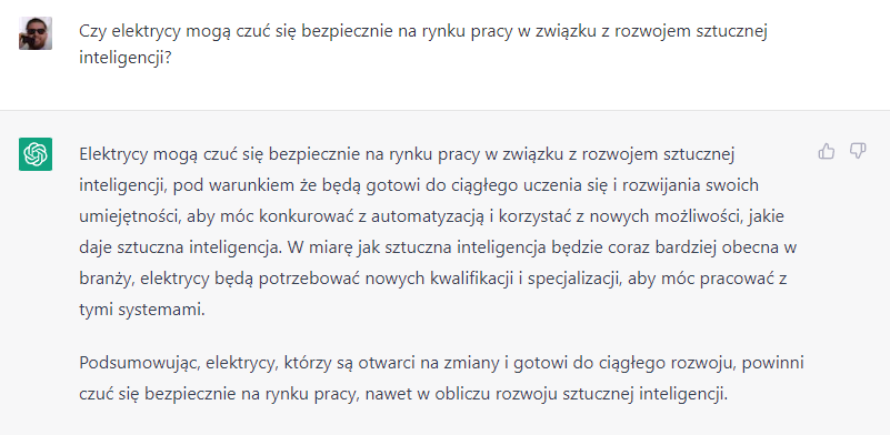 Rozwój sztucznej inteligencji na tym poziomie i etapie jaki znamy albo w najbliższym czasie się pojawi jak na razie mnie nie martwi z punktu widzenia mojej pracy. Martwią mnie bardziej zachowania społeczne z tym związane. Jak na razie zgodzę się z @Sandro1812 , że AI nie jest kreatywne ani nie myśli abstrakcyjnie. Nawet jeżeli czytając to co sama sztuczna inteligencja pisze na temat przyszłości zawodu elektryka nasze pokolenie elektryków może spać spokojnie pamiętając jednak o tym, że jest to zawód wymagający ciągłego dokształcania się.