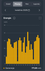Moc łączna paneli 6,75kW. W kwietniu 2025 wyprodukowały 771,95kWh. Niestety falownik w godzinach szczytu wyłącza się przez zbyt wysokie napięcie. Dla porównania rok temu w kwietniu 699,03kWh, w 2023- 581,38kWh, w 2022- 646,21kWh. Więc mimo występującego problemu (który i tak udało mi się w pewnej skali ograniczyć) mam największą produkcję w kwietniu względem poprzednich lat. Wychodzi na to, że w tym roku kwiecień był mocno słoneczny.