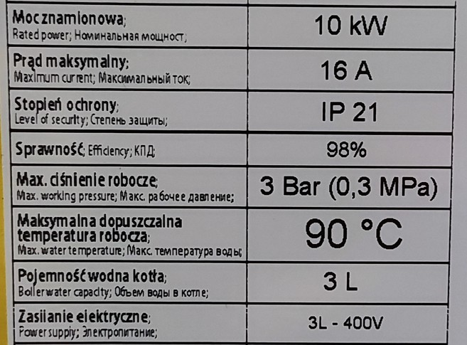 Producent kotła indukcyjnego podaje na tabliczce znamionowej dane: