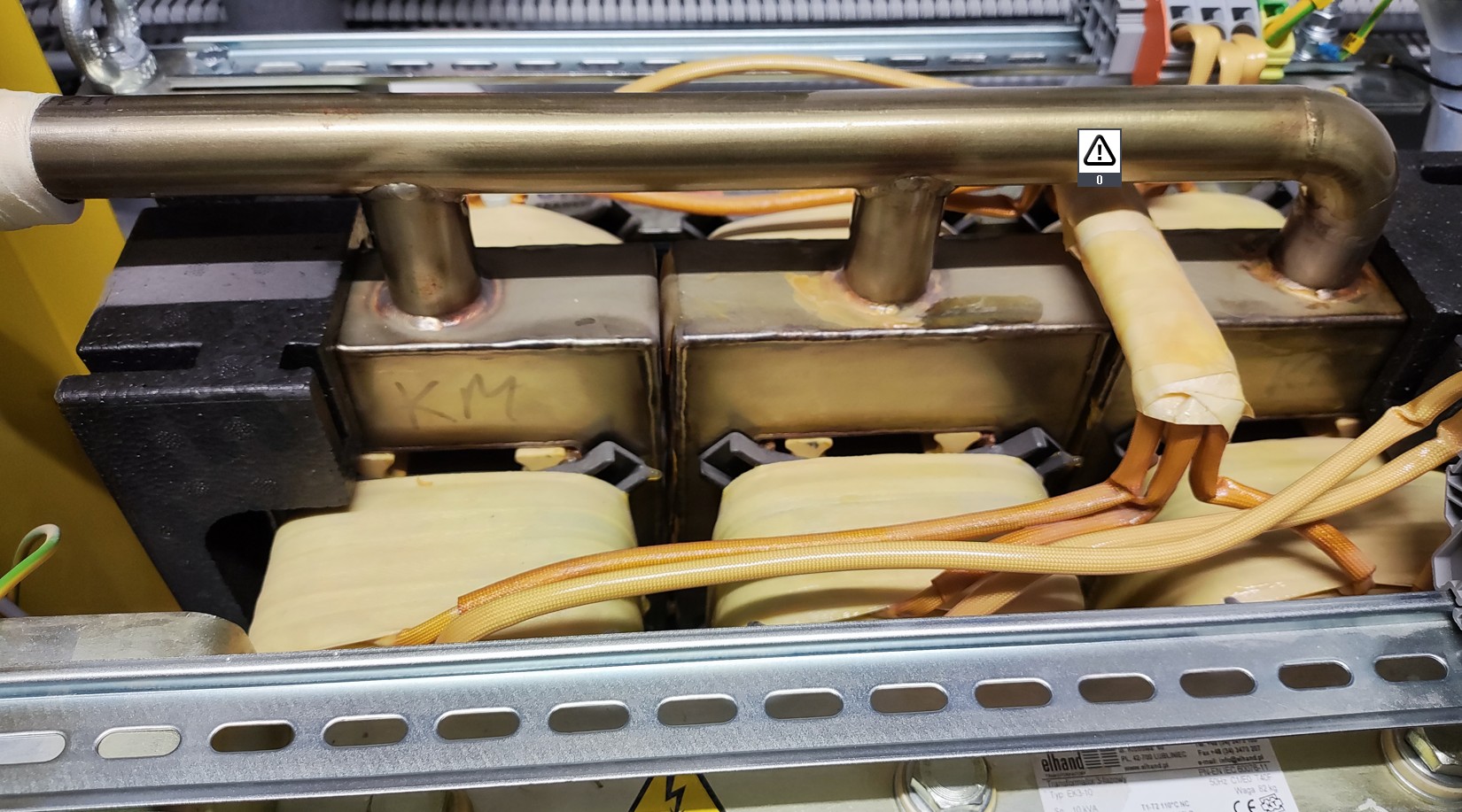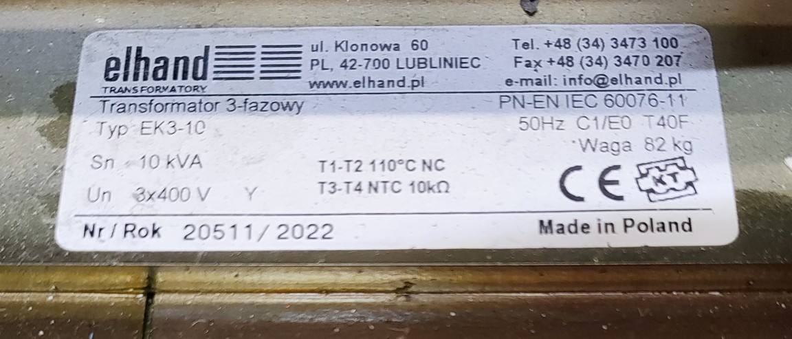 Po zdjęciu obudowy ukazuje się transformator trójfazowy z uzwojeniem wtórnym w postaci zwartych rur w stanie pracy wypełnionych wodą i tabliczka znamionowa: