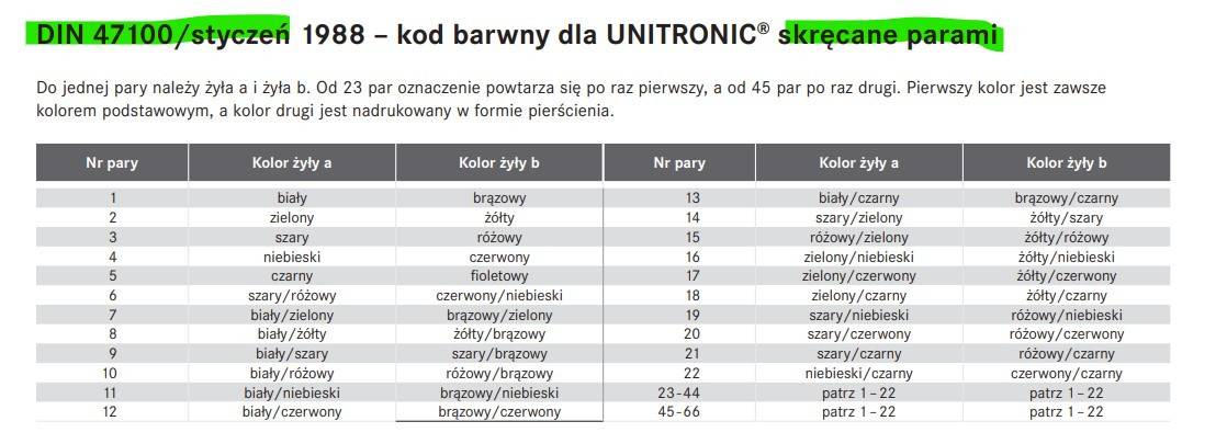 Wskazany plik PDF jest poprawny. Trzeba korzystać z tabeli dla kabli UNITRONIC i kodu kolorów DIN47100 (osobno dla parowanych o nieparowanych kabli - choć tak naprawdę kolejność kolorów jest taka sama na początku).