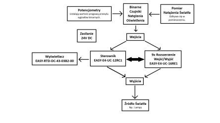 Celem projektu jest zrealizowanie inteligentnego systemu poziomu oświetlenia w pomieszczeniach przy pomocy binarnych czujników natężenia światła, których regulacja odbywa się przez potencjometr. Czujniki wysyłają sygnał w postaci logicznej jedynki do wejść sterownika PLC i modułu wejść cyfrowych, gdy w danym pomieszczeniu następuje spadek właściwego natężenia światła. Natomiast sygnał w postaci logicznego zera jest wysyłany, gdy jest odpowiedni poziom natężenia światła. Sterownik informuje, poprzez wyświetlacz, o braku odpowiedniego poziomu oświetlenia w danym pomieszczeniu i załącza światło w nim. Następnie przekaźnik programowalny wysyła wiadomość e-mail na wybrany adres, informując o włączeniu lub wyłączeniu światła w danym pomieszczeniu. W godzinach od 22:00 do 6:00, na podstawie zegara czasu rzeczywistego, przekaźnik programowalny nie sprawdza obecności oświetlenia. W godzinach porannych sterownik czeka na dostanie się światła dziennego do pomieszczenia, dopiero wtedy zaczyna sprawdzać poziom oświetlenia.