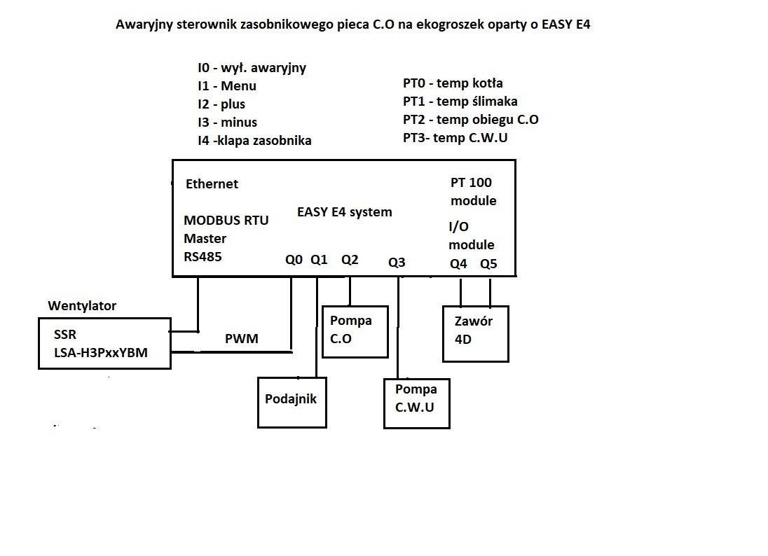 Easy E4 uzbrojone w parę modułów, wydaje się dosyć ciekawym zapleczem do zbudowania takiego awaryjnego sterownika, zwarzywszy, że zbliża się nam kolejna zima. Ogólnie jednostka centralna musiałby być w wersji tranzystorowej, ponieważ przyda się wyjście PWM. Założenie układowe jest następujące.