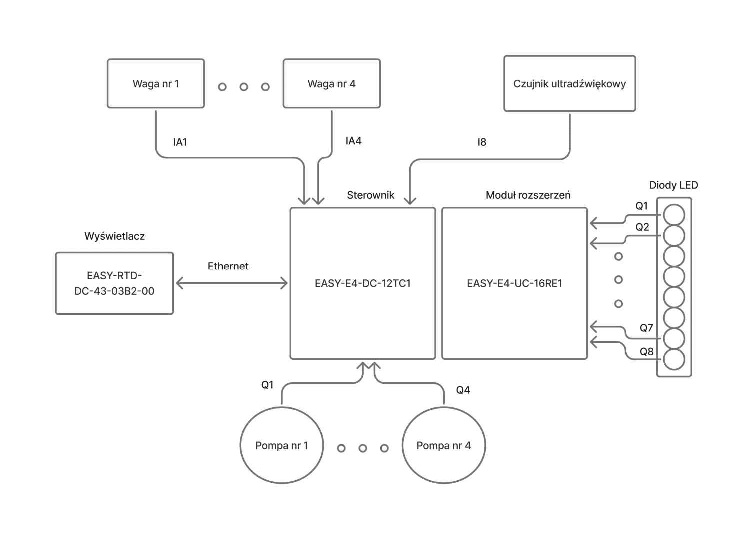 W projekcie zostanie użyty sterownik EASY-E4-DC-12T1, moduł rozszerzeń EASY-E4-UC-16RE1 oraz ekran EASY-RTD-DC-43-03B2-00. Taki dobór komponentów, pozwoli na ewentualne, bardzo proste, rozbudowanie urządzenia w przyszłości - w przypadku chęci dodania kolejnych czterech pomp oraz diod sygnalizacyjnych. Zwiększenie ilości pomp, będzie skutkowało zwiększeniem ilości wag, potrzebnych do kontrolowania pojemności butelek z składnikami. Problem ten można rozwiązać poprzez dodanie kolejnego modułu, np. EASY-E4-DC-6AE1. Na tylnej części urządzenia zamontowane zostanie gniazdo IEC C13.