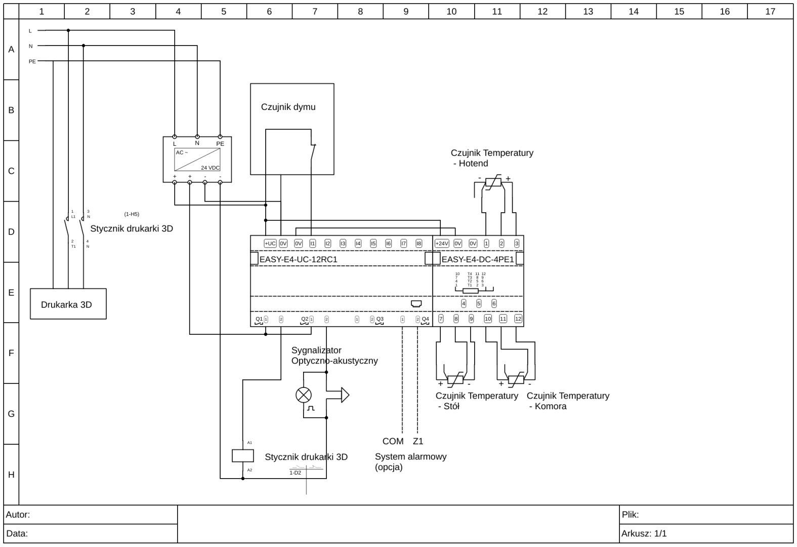 Problem tzw. thermal runaway w drukarkach 3D polega na niekontrolowanym wzroście temperatury elementów grzejnych – hotendu, stołu lub komory – w wyniku uszkodzenia czujnika, awarii układu sterującego lub błędu oprogramowania. Może to prowadzić do przegrzania i w konsekwencji do pożaru. Aby wyeliminować to ryzyko, projekt zakłada zastosowanie niezależnego systemu nadzoru opartego na sterowniku PLC. Urządzenie będzie monitorować temperaturę z trzech czujników PT1000 oraz stan czujnika dymu. W przypadku wykrycia przekroczenia bezpiecznych progów lub obecności dymu system natychmiast zareaguje – odcinając zasilanie i sygnalizując zagrożenie. Dzięki temu możliwe jest zwiększenie bezpieczeństwa użytkowania drukarek 3D i ochrona przed skutkami awarii układów grzewczych.