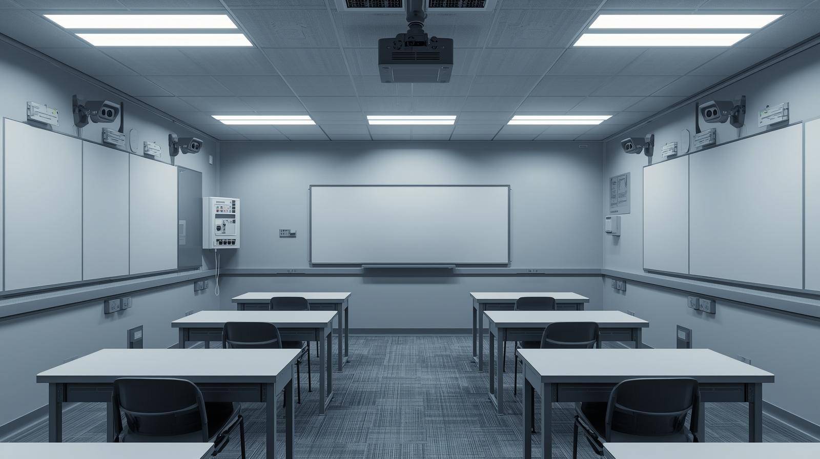 PLC analizuje poziom hałasu – jeśli przekroczy określony próg, system wysyła sygnał ostrzegawczy nauczycielowi lub uruchamia kamerę skierowaną na podejrzane miejsce.