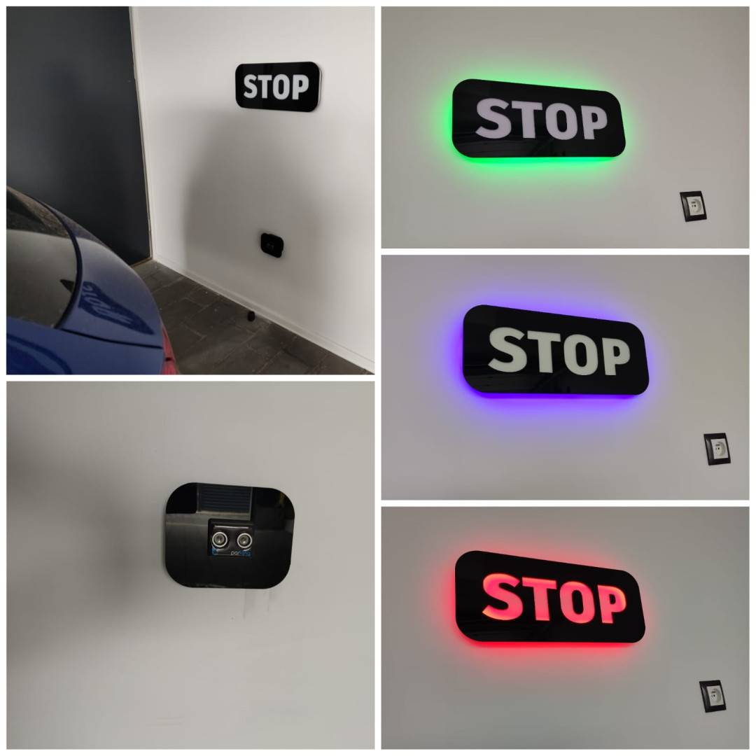 To przystąpiłem do planowania i pierwszego prototypu. Z pomocą przyszedł mi parKing sensor od @BleBox Pomysł był prosty. Robimy napis STOP z pleksi i wykorzystujemy taśmę led RGB do podświetlenia na różne kolory w zależności od odległości. Tak powstał pierwszy prototyp (widoczny na zdjęciach). Po wstępnej akceptacji że robimy takie coś tylko z efektem WOW, przeszedłem na dalszy etap planowania i prac. Tu już trzeba było wszystko dokładnie wymierzyć, zaplanować i kupić idealnie przyciętą pleksi. Z wycięciem napisu i zaokrąglonych rogów pomógł mi kolega przy pomocy lasera. To był moment w którym rozpoczęła się mordęga i przypalone palce przy grzaniu opalarką pleksi i wyginaniu w fajny owalny kształt. Następnie trzeba było wszystko skleić, dołożyć paski led i podłączyć. Pozostał jeden problem do rozwiązania. Kiedyś taśmy się zepsują i będzie trzeba wymienić. Musi to być otwierane więc wykonałem sprytne mocowanie na magnesy i można zdjąć front i dostać się do środka.Teraz trzeba coś wymyślić żeby ten sensor nie był taki "goły". Szybki prototyp z sklejki a potem wykonanie w pleksi. Moim zdaniem prezentuje się rewelacyjnie.