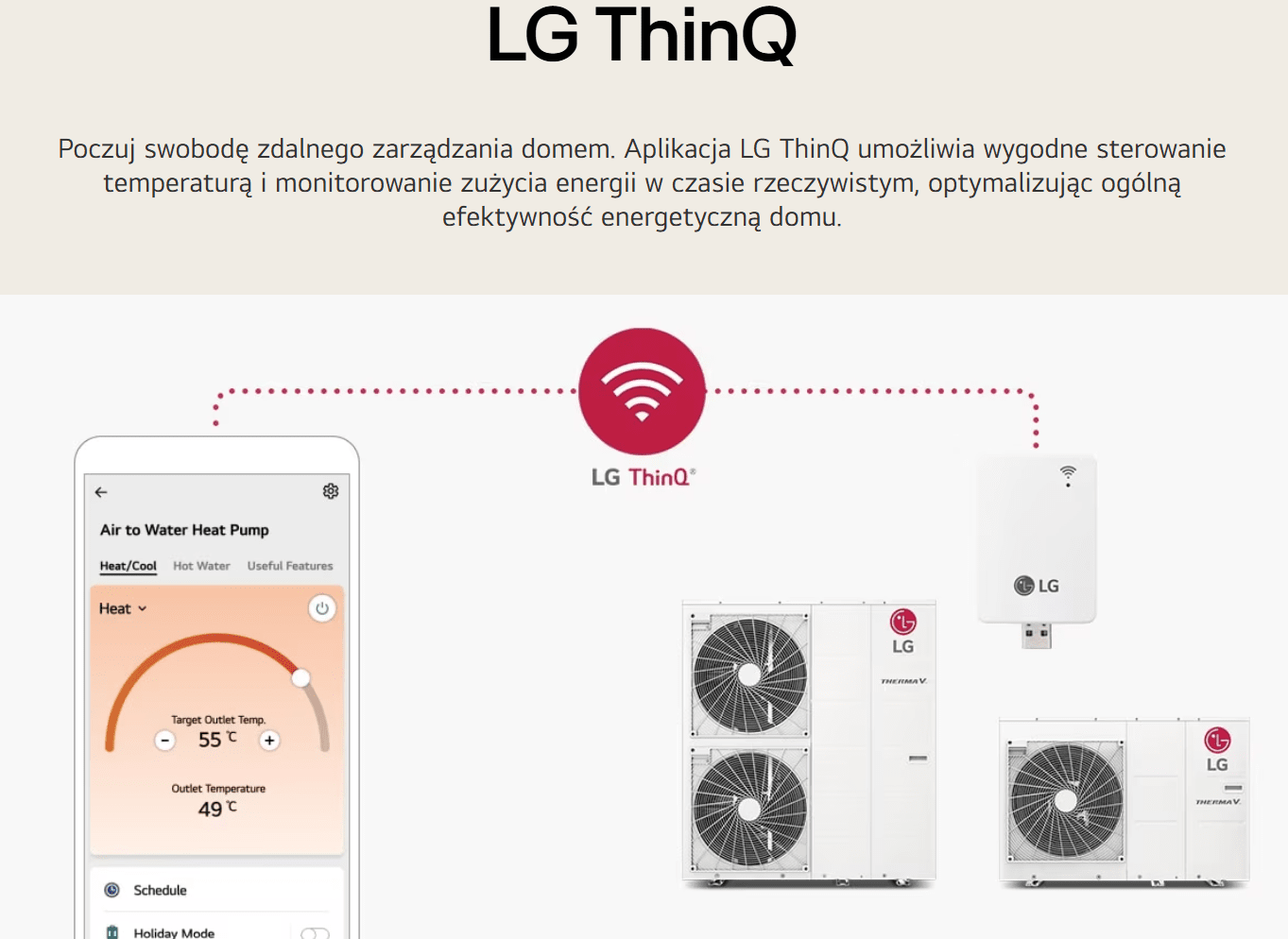 Do sterowania zdalnego po WiFi należy dokupić moduł WiFi i zainstalować aplikację LG ThinQ, która umożliwia wygodne sterowanie temperaturą i monitorowanie zużycia energii w czasie rzeczywistym, np za pomocą smartfonu z androidem lub ios.