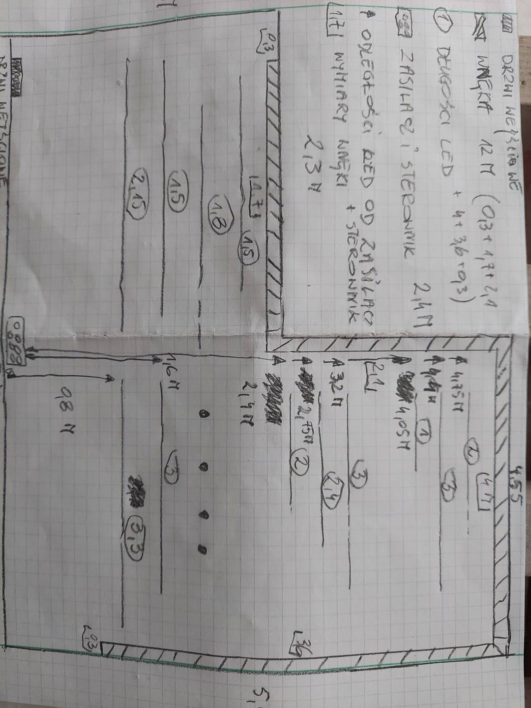 Obrysowka wokół sufitu pierwotnie miala zostać zasilona na początku i na końcu taśmy led, 2 różnymi przewodami. Zasilanie do początku taśmy od zasilacza ma długość 3 m.