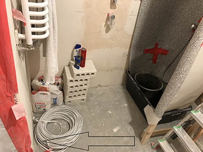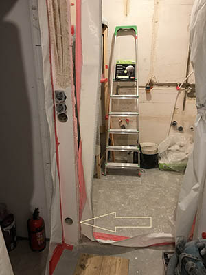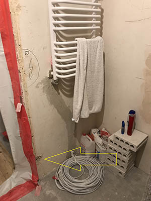 - zarówno to miejsce gdzie są włączniki na korytarzu (oznaczone na zdjęciu piorunem), podobnie jak i okolica wejścia do puszki również zabezpieczona płatem materiału przeciwwilgociowego
