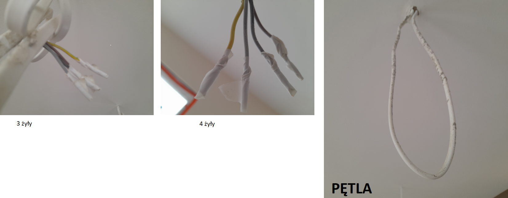1. Zdjęcie "3-4 żyły+pętla" - jak podłączyć do lampy, który kabel zostaje wolny? Dlaczego czasem z sufitu wystaje kabel 3, a czasem 4 żyłowy? + "Pętla" - z sufitu w kilku miejscach wystaje taka pętla. Czy mam ją rozciąć na pół? I jak podłączyć?
