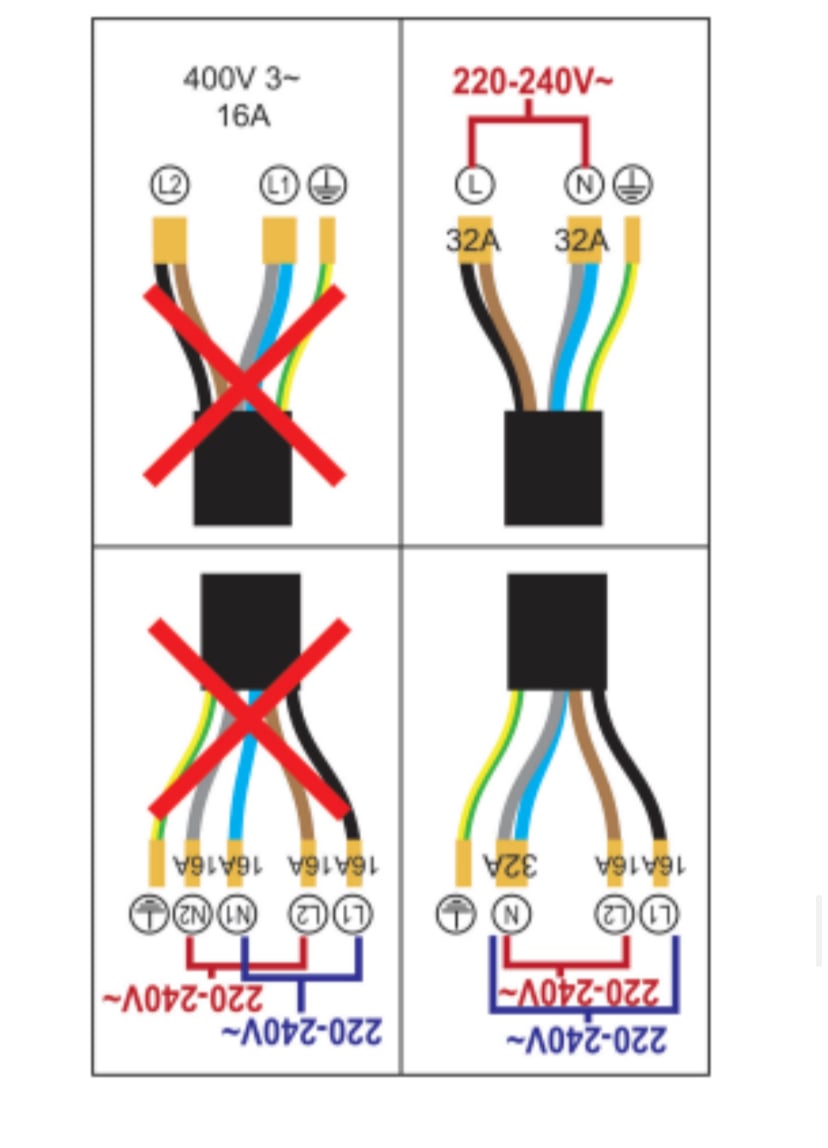 UWAGA1: Instrukcja przewiduje przy prądzie roboczym 32A przekrój 1,5mm2. Jest to w moje ocenie błąd, tutaj zgadzam się z @artel electric iż nawet 2,5mm2 to za mało - sugeruję 6mm2. 2,5mm2 by wystarczyło przy podłączeniu 2-fazowym (16A), ale na pewno nie 1,5mm2.