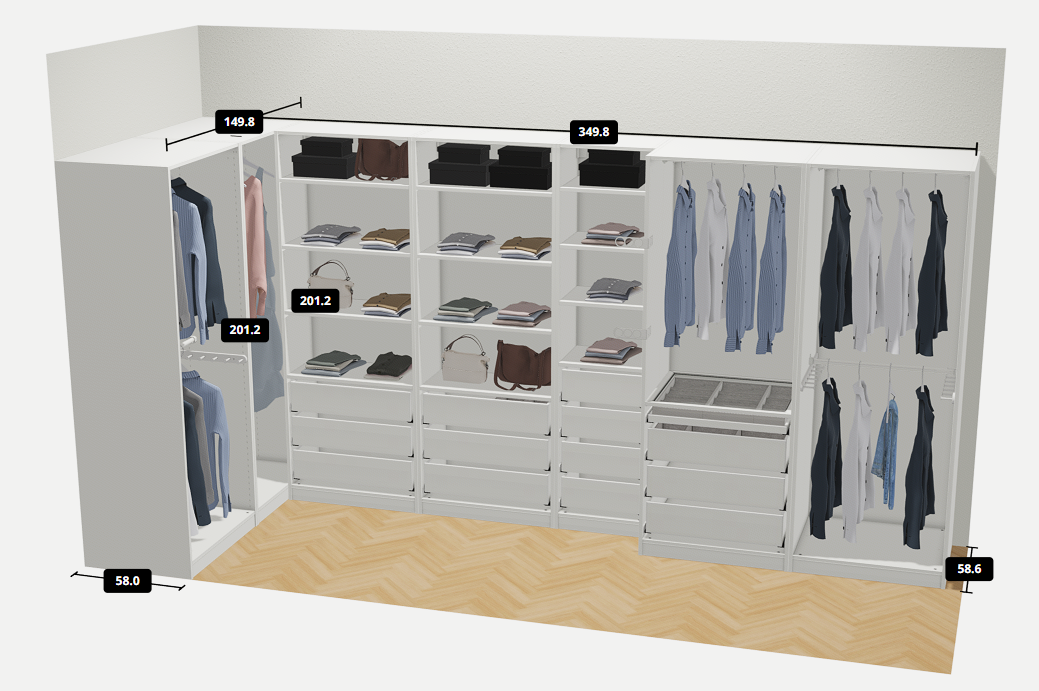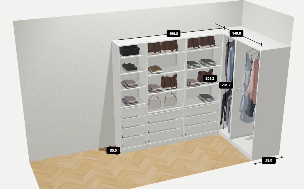 jestem w trakcie planowania garderoby na bazie mebli PAX z Ikei. Załączam trzy grafiki prezentujące moją garderobę. Chciałbym dodać do niej oświetlenie LED bazując na produktach z Waszej oferty. Zależy mi na oświetleniu półek oraz wieszaków, wystarczy profil z taśmą LED u góry każdej półki (z przodu), ale byłoby dobrze gdyby taśma LED skierowana była pod kątem do wewnątrz, tak aby nie oślepiała osoby stojącej przed szafą. Czy są Państwo w stanie doradzić jaką taśmę LED najlepiej kupić i jakie elementy dodatkowe dobrać. Całość będzie włączana centralnym włącznikiem, nie będę stosować żadnych dodatkowych czujników.
