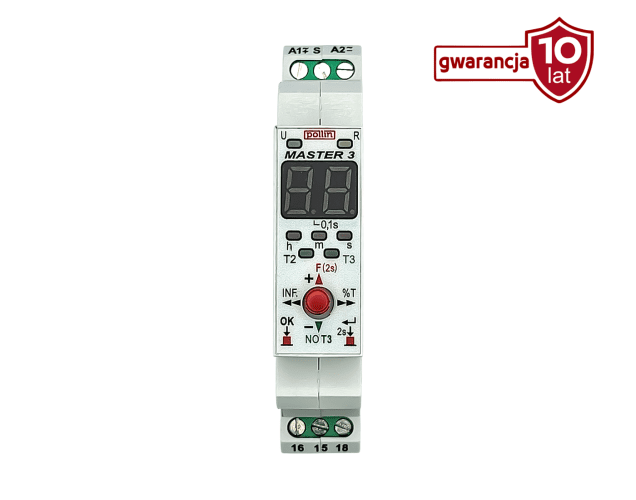 - MASTER-3 - obsługuje aż 28 funkcji czasowych⏱️ (0,1s ~ 100h). Pozwala na niezależne nastawy czasów T1, T2 i T3. Idealny do zaawansowanych aplikacji automatyki.