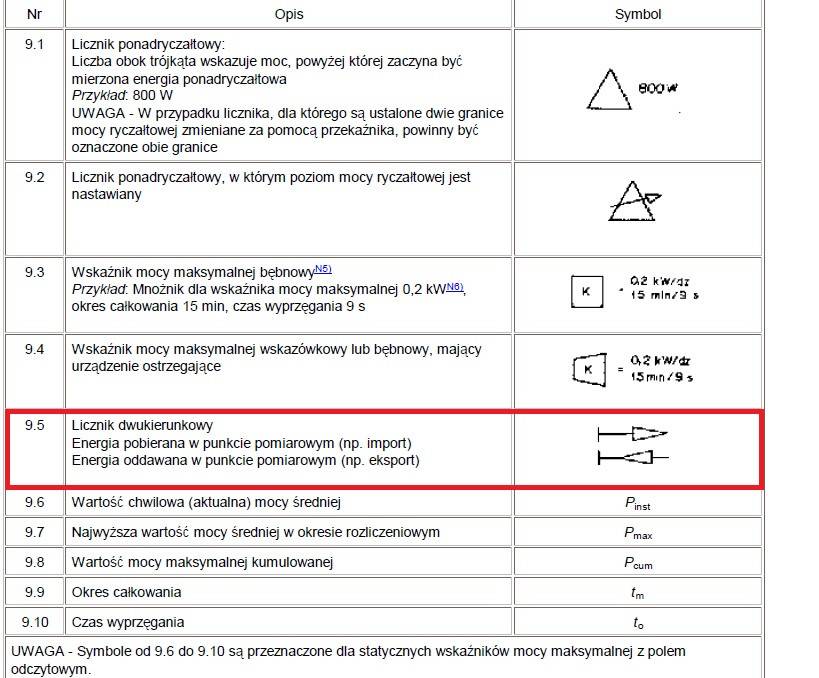 Symbol licznika 1-kierunkowego jest znany od wielu lat i jeśli go nie znacie to trudno = Wasza strata. Strzałka jest w prawo , bo tak kręcą się tarczki w starych już licznikach indukcyjnych. Wystarczy zajrzeć do jakiejś szafki licznikowej, a nie wypisywać ironicznych uwag. Nie podam podstawy prawnej tego symbolu, bo nie robię notatek o źródłach informacji, ale załączam fotkę z "Poradnika Projektanta Elektryka" wyd. Medium /ElektroInfo. Wielu z Was ma oczywiście ten poradnik, więc tam należało zajrzeć. Symbol 2-kier. widywałem na projektach PV i zapewniam Was, że każdy średnio rozgarnięty elektryk będzie wiedział o co chodzi.