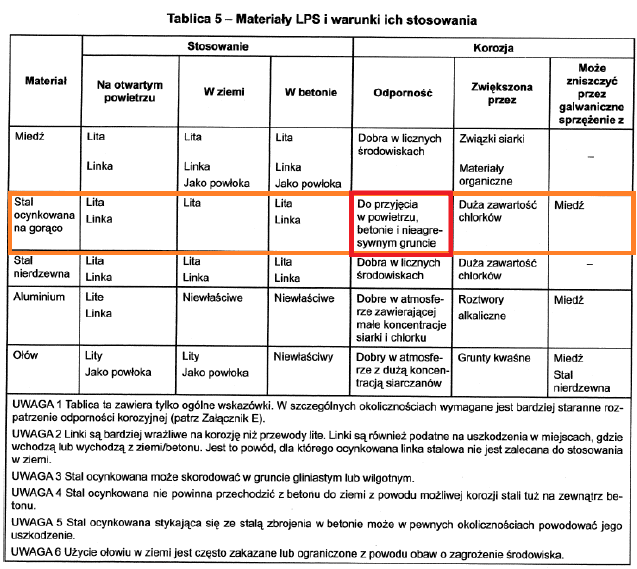 Stal może być ocynkowana lub nieocynkowana."O powyższym stanowią normy PN-EN 62561-1 i PN-EN IEC 62561-2 do których dostępu nie mam, więc wierzę na słowo. Dysponuję natomiast normą PN-EN 62305-3 która zawiera jak w załączniku '1'