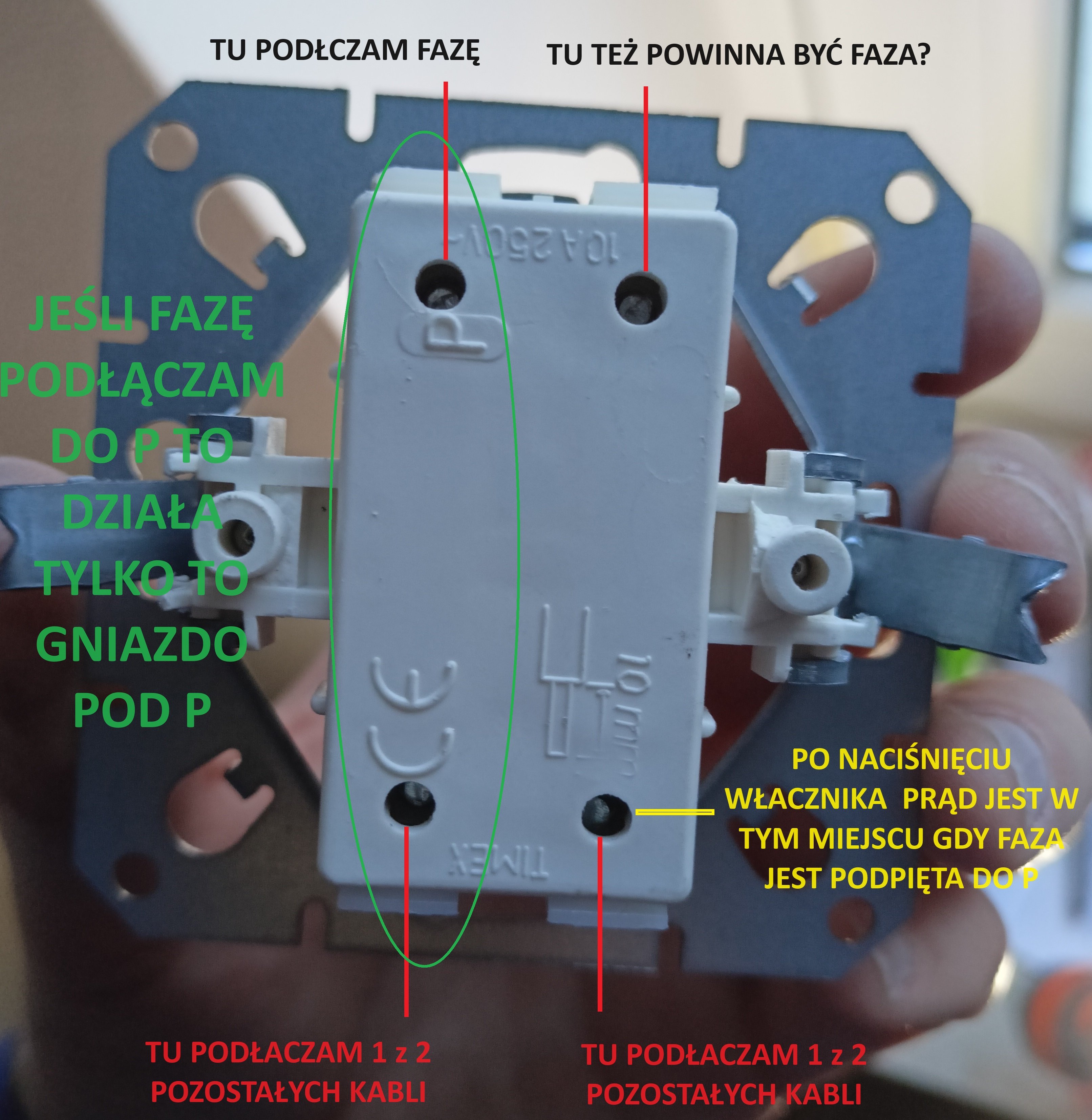 Po podpięciu fazy pod "P" działa tylko ten przycisk który jest bezpośrednio pod P. Jeśli zamienię kable, to roleta jeździ w górę lub dół więc mechanizm działa. Nie działa natomiast druga strona włącznika, chociaż prąd tam dopływa. Czy w tej sytuacji faza powinna być podpięta do P ale i do tego gniazda obok (na górze)? A pozostałe dwa kable do wejść na dole?