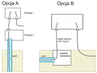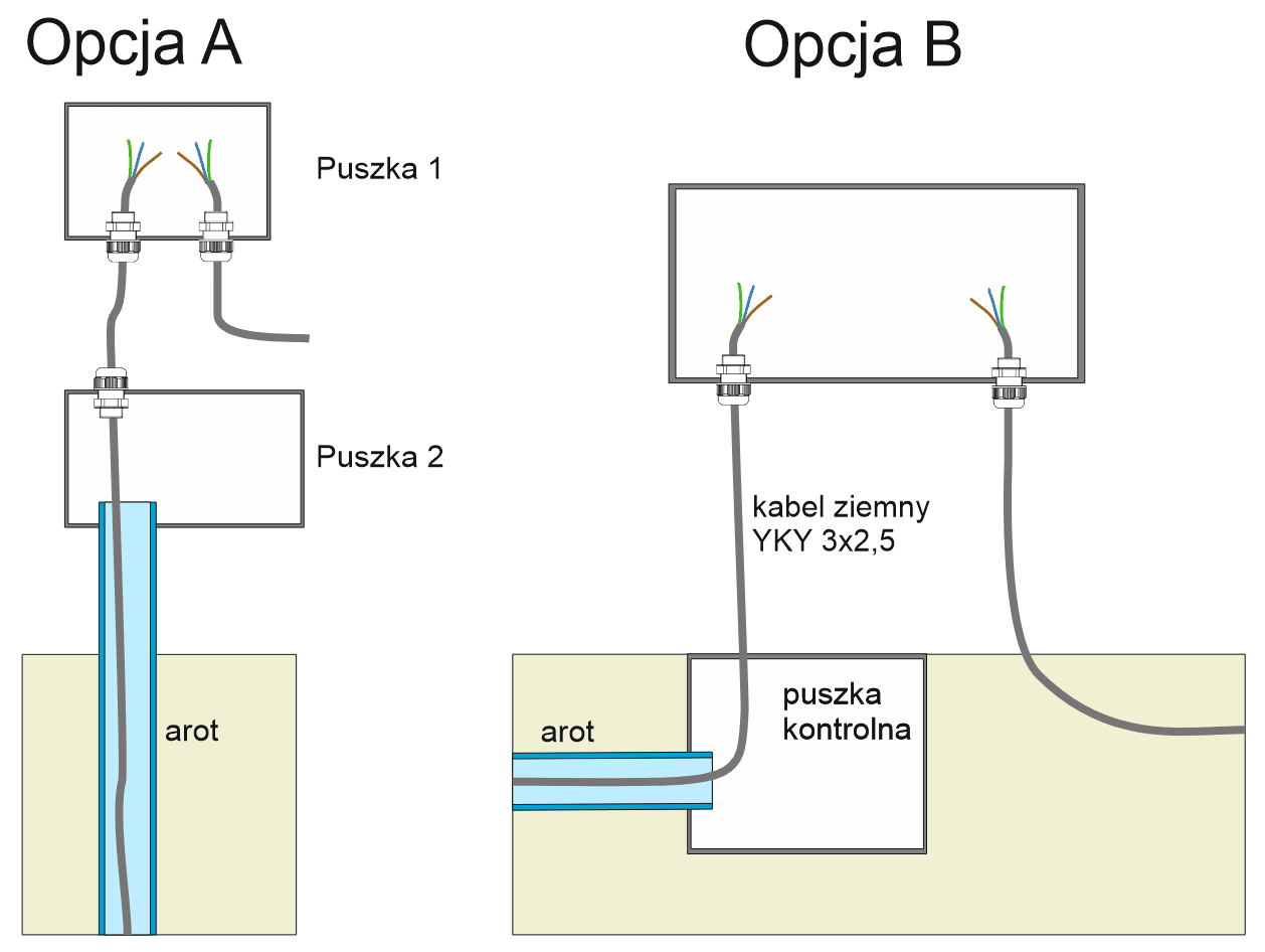 Opcja A) arot wprowadzamy do puszki nr 2 poprzez zwykły otwór. Puszka ta ma robić jedynie za punkt przejścia arot -> kable ziemne i jako osłona zakończenia arota przed wodą. Właściwych połączeń żył dokonujemy w osobnej hermetycznej puszce nr 1, do których kable wchodzą poprzez dławiki (więc nie będzie tam wilgoci).Opcja B) arot wchodzi w ziemi do studzienki gruntowej, np. takiej jak tu: https://hurtowniatechnik.pl/userdata/public/gfx/2500/4adc58ce4e80a92ae2ad64f478c4.jpg