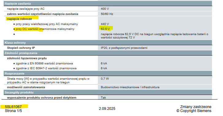 Seria 5SL6 jest bazowo przeznaczona do sieci AC i takie ma bazowe opisy. Natomiast może pracować przy napięciu DC co potwierdzają dane techniczne (fragment karty w załączniku).